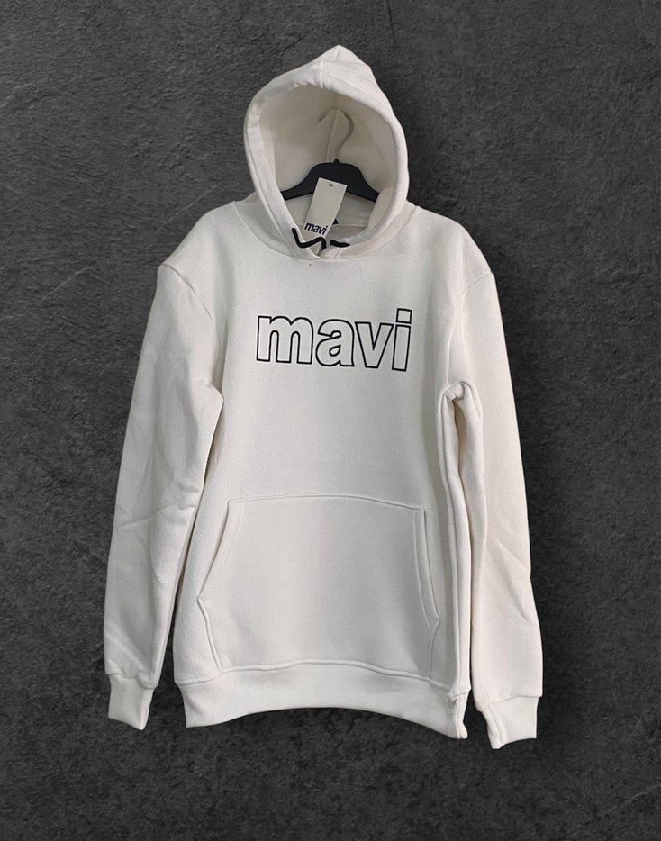 Üç iplik kumaştan, uzun kollu, kapüşonlu ve rahat kesim beyaz sweatshirt. Önünde baskısı ve cep bulunur. Rahat sokak stili için uygun.