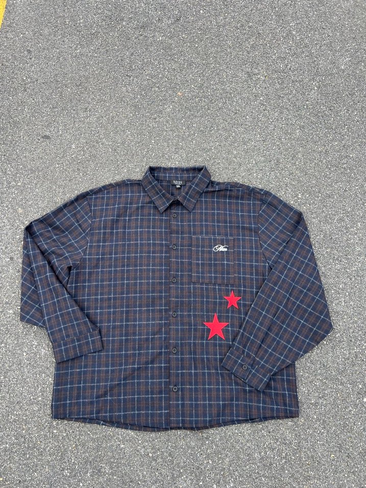 Erkek gömleği uzun kollu, düğmeli ve yakası notched lapel. Geniş kesim, koyu gri kareli ve kırmızı yıldız detaylı, yumuşak ve sıcak kumaştan. Günlük kullanıma uygun. ✨