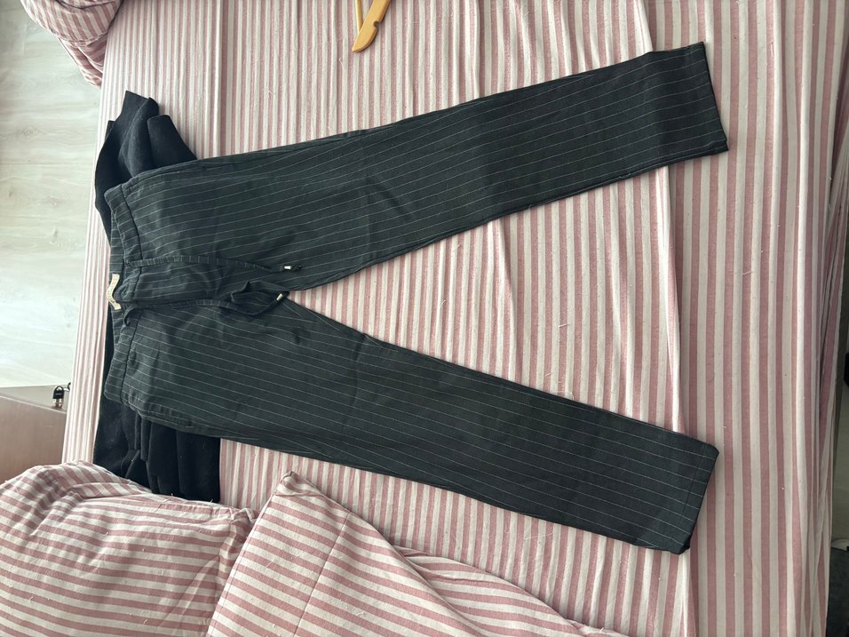 Unisex kemerli, çizgili ve normal boyda kumaş pantolon. Sentetik kumaştan, ofis için uygun koyu gri renkte.