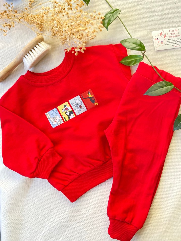Unısex Kırmızı Baskılı Sweatshirt ve Eşofman Takımı