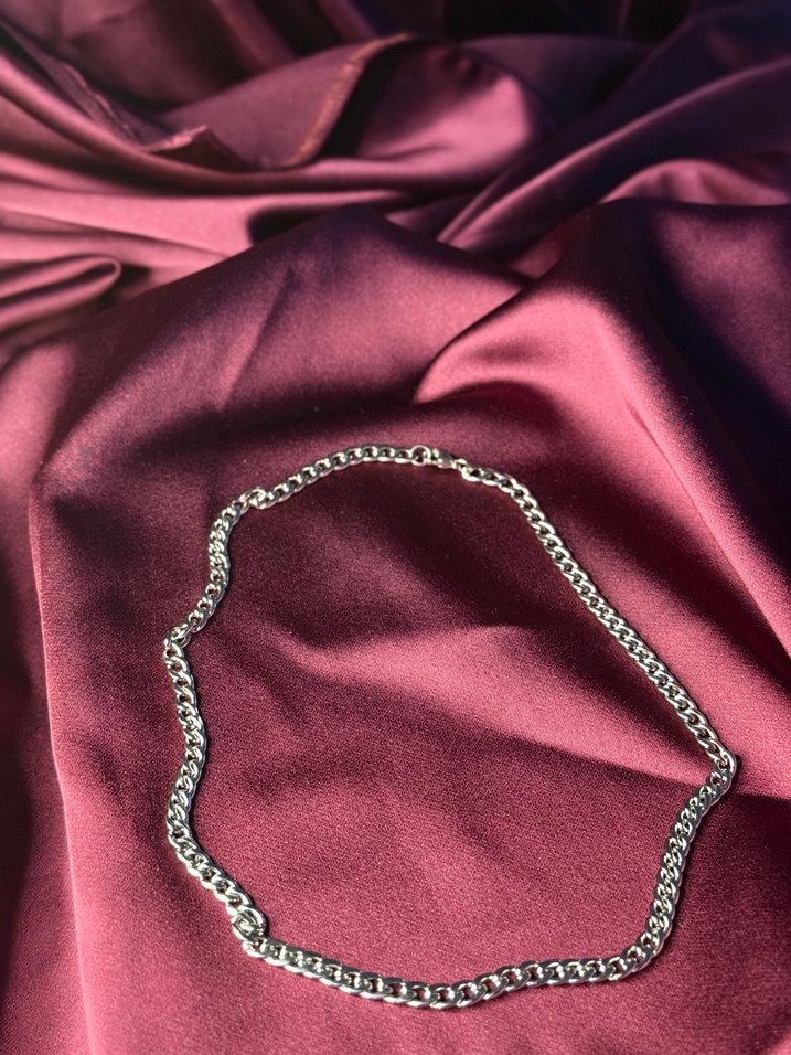 Hem erkek hem kadınlar için gri zincir detaylı, minimalist tasarıma sahip el zinciri. Günlük kullanım için uygundur ve bordo zeminle hoş bir kontrast yaratır. ✨