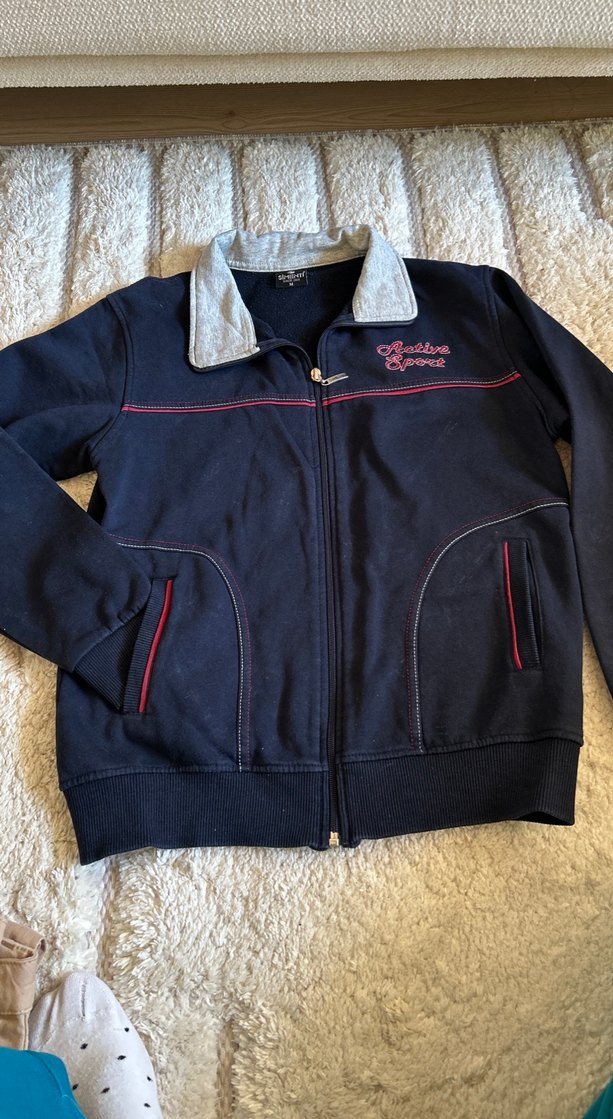 Fermuarlı ve yakalı, hafif dar kesim lacivert üst.Yumuşak ve sıcak kumaştan, kırmızı detaylarla sokak stiline uygun.