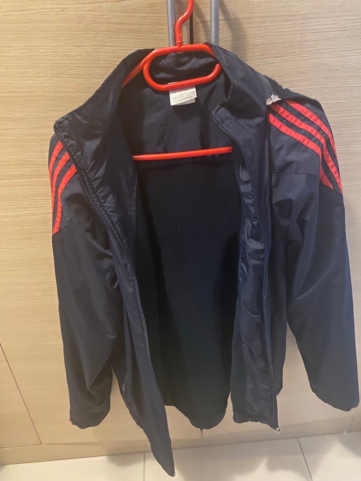 Unisex fermuarlı, yüksek yakalı, yumuşak ve sıcak kumaştan yapılmış, lacivert ve kırmızı çizgili spor tarzda spor mont