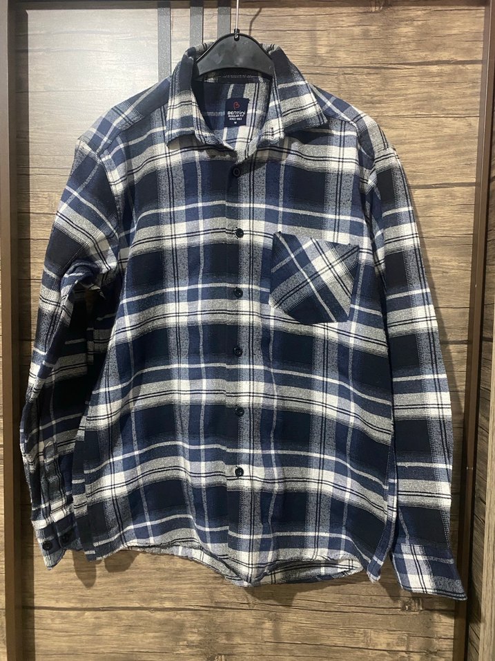 Erkek ve kadınlar için rahat kesim, uzun kollu ve düğmeli, yumuşak ve sıcak kumaştan yapılmış lacivert ve gri kareli gömlek. Göğüs cebine sahip, gündelik kullanım için uygundur.