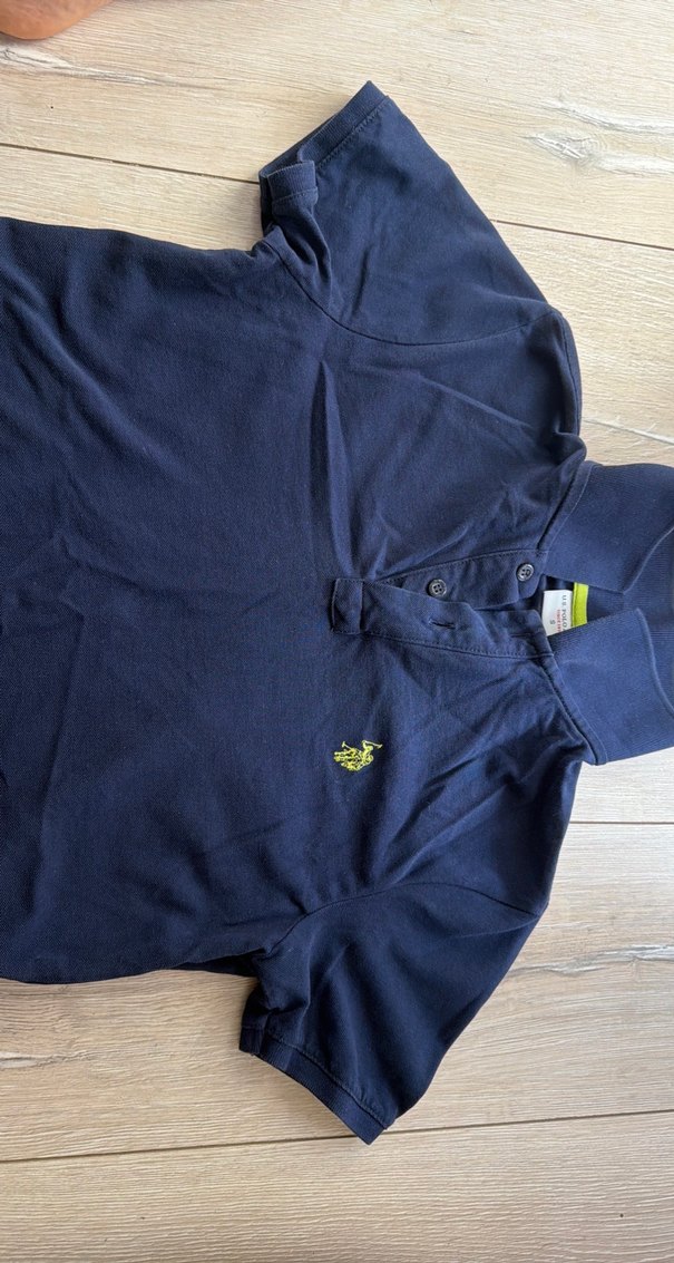 yakalı ve düğmeli kısa kollu polo tişört. Lacivert sentetik kumaştan, günlük ve sokak stiline uygun.