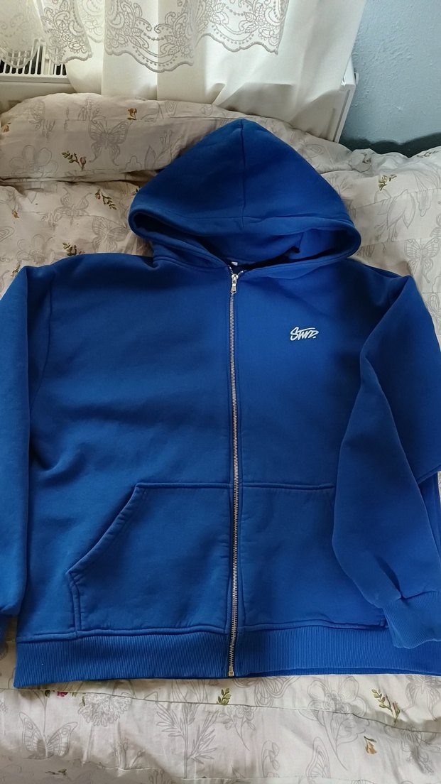 mavi kapüşonlu sweatshirt, parlak kumaş, fermuarlı ön ve uzun kollu. Rahat ve sade tasarımlı, günlük kullanım için uygun.