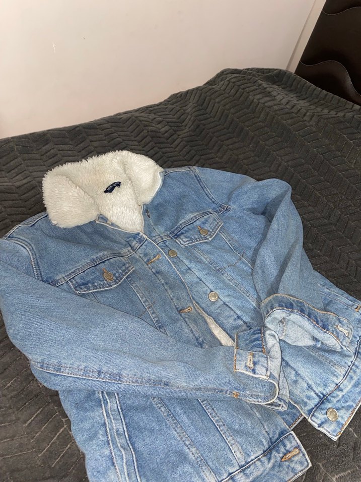 Kadınlar için mavi-gri denim kumaştan, yakası kürklü, uzun kollu ve vücuda oturan kesime sahip normal midi uzunluğunda ceket. Günlük rahat kullanıma uygundur. m beden