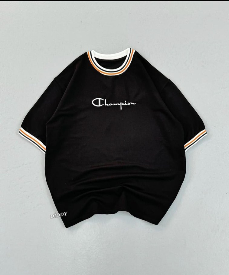 Champion markalı, siyah pamuk oversize tişört. Kısa kollu, yuvarlak yaka ve kol ile yaka uçlarında şerit detaylıdır. Rahat ve oversize ürün.