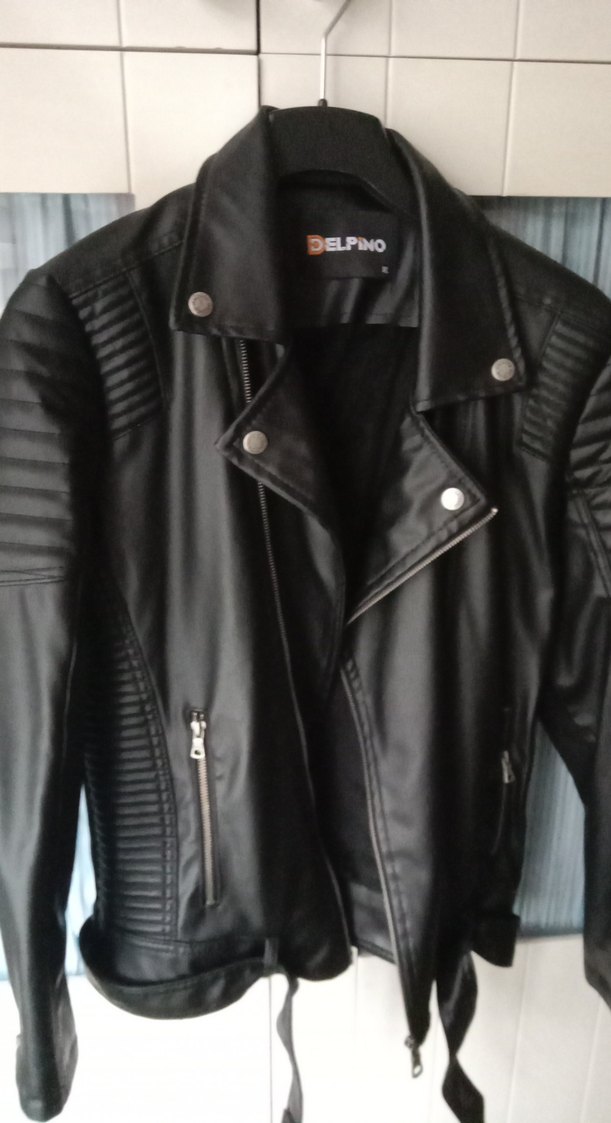 Siyah deri biker ceket, keskin yakalı, fitted kesim ve kemerli bel detayına sahiptir. Askılı kollu ve normal boyda, günlük kullanıma uygundur. Marka DELPINO etiketlidir. Orjinal deridir, içi yündür.