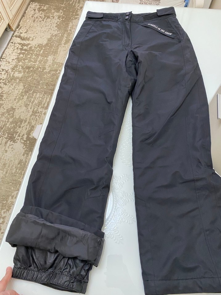 Siyah, belden kemerli, rahat kesime sahip kayak pantolonu. Sentetik kumaştan üretilmiş, normal boyda ve dış mekan kullanımı için uygun rahat bir tarzda. Yalnızca iki gün giyildi topuk kısmında iç kesimde gözükmeyen yerde ufak bir açılma oldu kullanıma hiçbir engel değil zaten gözükmüyor içte kalıyor rahat kalıp bel ölçüsü 40 santim civarında