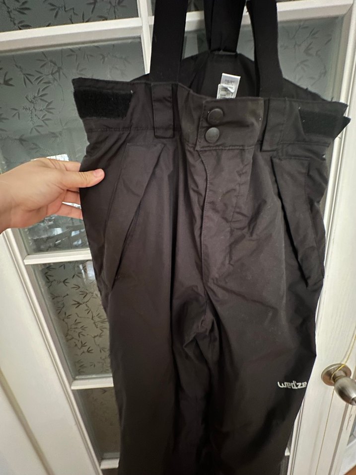 Unisex siyah kayak pantolonu, bol kesim ve Velcro ayarlı, dayanıklı sentetik kumaştan outdoor kullanım için uygundur. Askılı ve desensizdir. Wed'ze markalı. ❄️