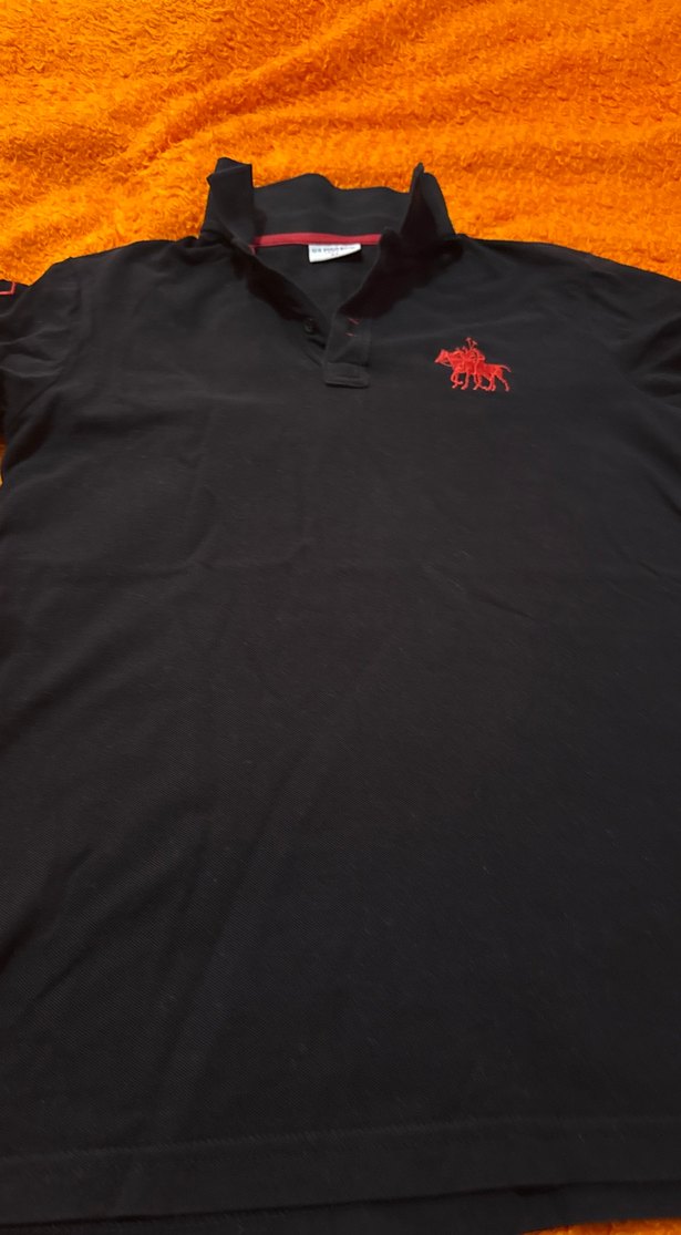 Unisex siyah polo yaka kısa kollu tişört, pürüzsüz sentetik kumaştan, göğüste kırmızı baskı detayıyla, rahat sokak stiline uygun kesim.