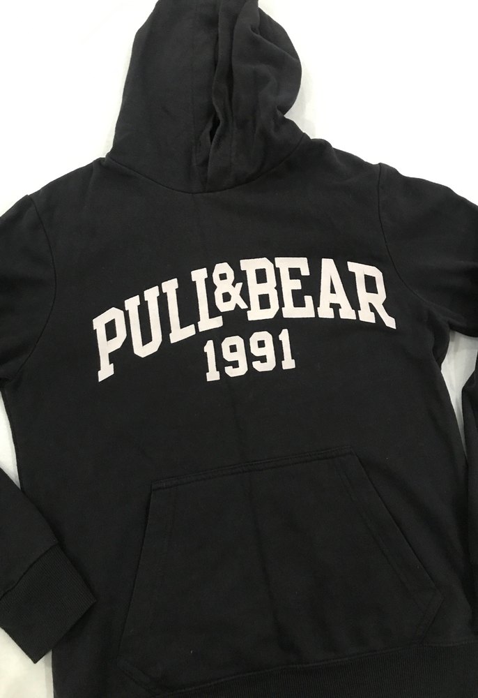 Siyah renkli, baskılı PULL&BEAR 1991 yazılı sweatshirt. Yuvarlak yaka, uzun kabarık kollu ve bol kesimdir. Ön cepli, yumuşak ve sıcak kumaş kullanılmıştır.