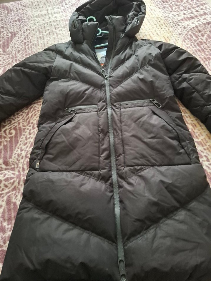 Kadınlar için uzun, fermuarlı ve siyah renkte, sentetik kumaştan yapılmış, rahat ve sokak stili kış montu. Notch yakalı ve gençlere uygun kesimde.