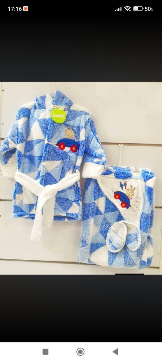 Erkek çocuk için mavi beyaz geometrik desenli, kapüşonlu terlikli havlulu emici kumaştan bornoz seti.Hamileyken hediye gelmişti .Bazaya kaldırdım dipte kalmış unutmuşum yeni farkına vardım. Oğlum 3 yaşında boyu uzun yıkadım bir kez giydirdim ama kısa oluyor.Yazık giydirmeye değmez ihtiyacı olan uygun yaşta biri kullansın. Başlıklı havlu terlik ve bornozdan ibaret . Yepyeni duruyor. Yumuşacık.