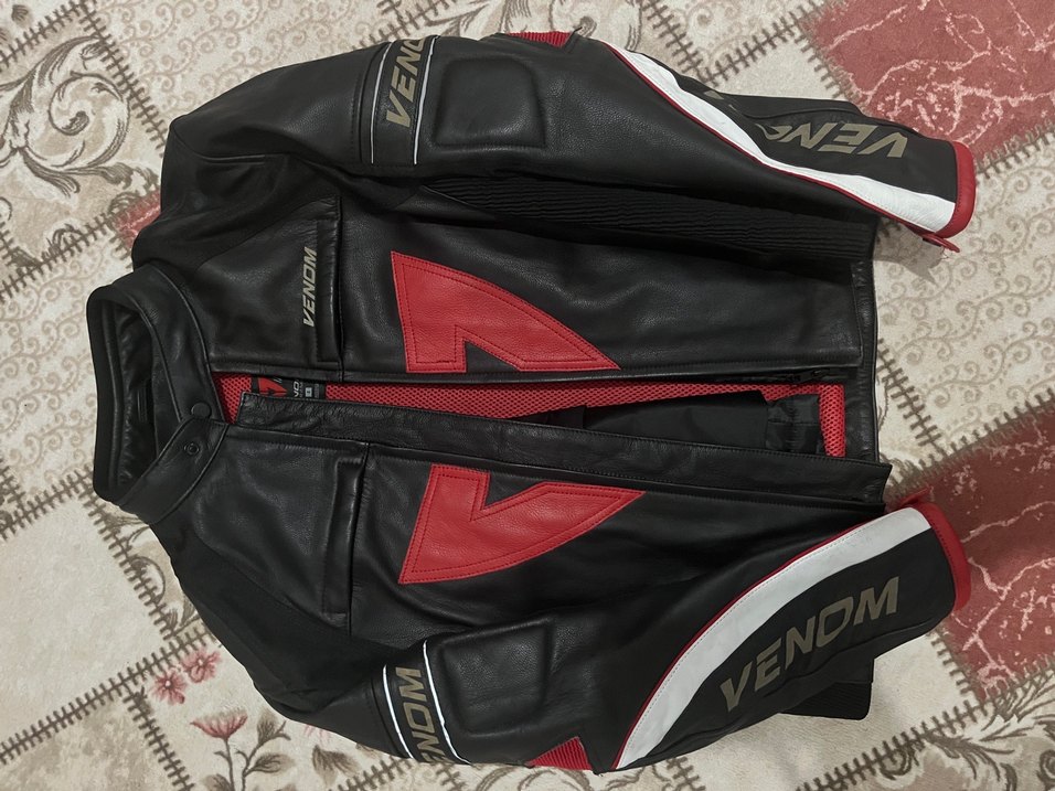 Fermuarlı, unisex kırmızı deri biker ceket, notalı yaka ve sportif detaylara sahip. S beden Sıfır ürün. 4 mevsim korumaları mevcut