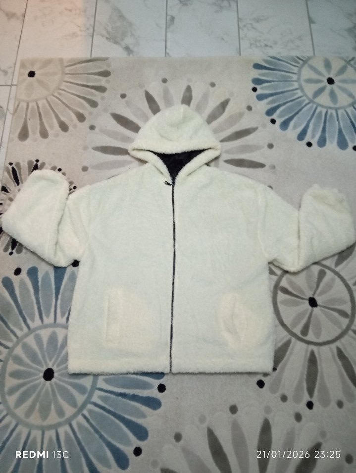 Yumuşak ve sıcak kumaştan yapılmış, kapüşonlu beyaz welsoft kuzu kumaşından unisex kadın ve erkek ceket.Fermuarlı, uzun kollu, bol kesim ve normal boydadır. Eteğinde ayarlanabilir lastikleri vardır. Rahat sokak stili için uygundur. Ürün sıfır üründür. Ürünün arka tarafında çok küçük kumaş hatası mevcuttur. ölçüler görselde yer almaktadır