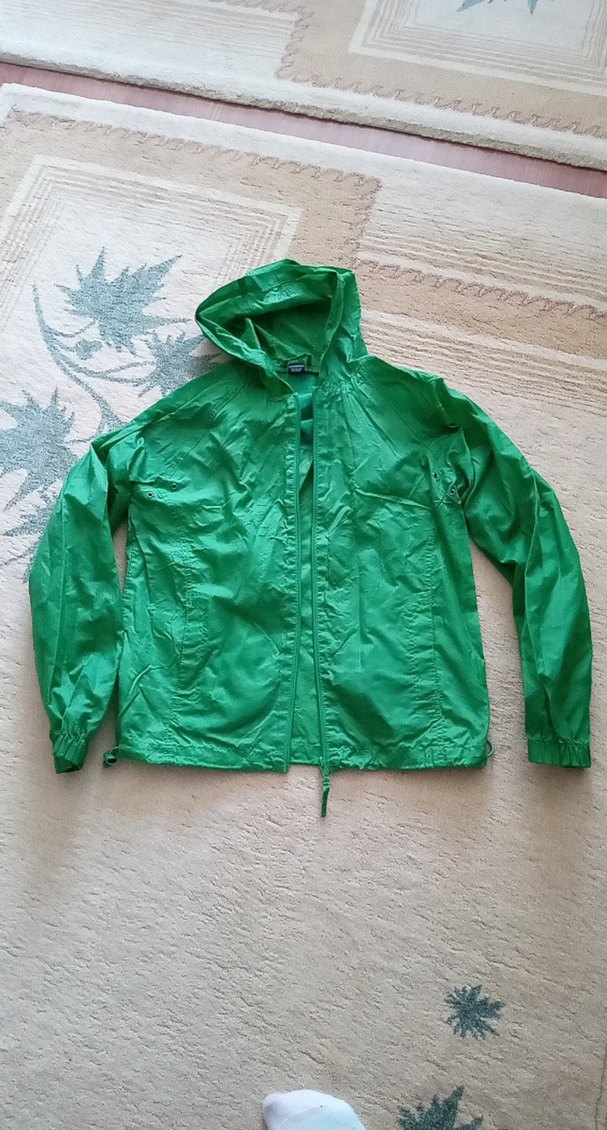 Erkek çocuk , kız çocuk ve kadın giyimine uygun yeşil rüzgarlık, parlak sentetik kumaştan, fermuarlı ve bol kesimlidir. Uzun kollu, kapüşonlu ve kesik yaka detaylıdır, dış mekan ve spor tarzlar için uygundur. 9-10 yaş yazıyor