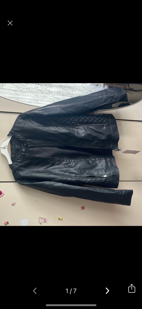 Unısex için siyah deri biker ceket, kesik yaka ve fermuarlı detaylara sahip. Normal kesim, uzun kollu, günlük kullanım ve sokak stiline uygun.