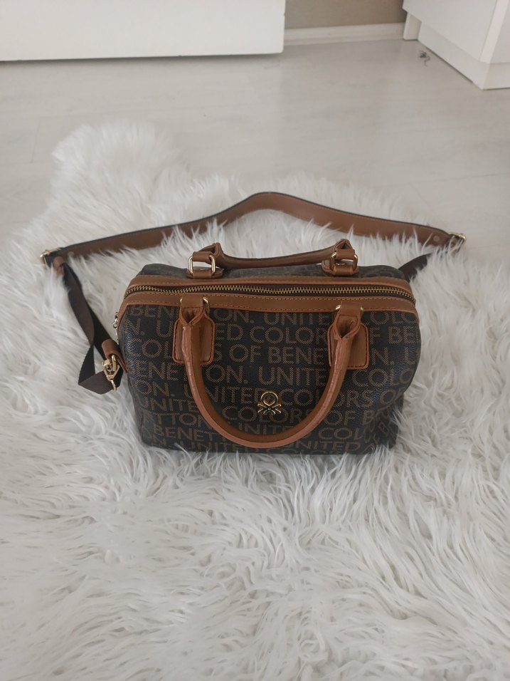 Kahverengi deri ve gri baskılı desenlere sahip, tokalı detaylı, günlük kullanıma uygun, modern ve rahat tarzda kadın çantası.