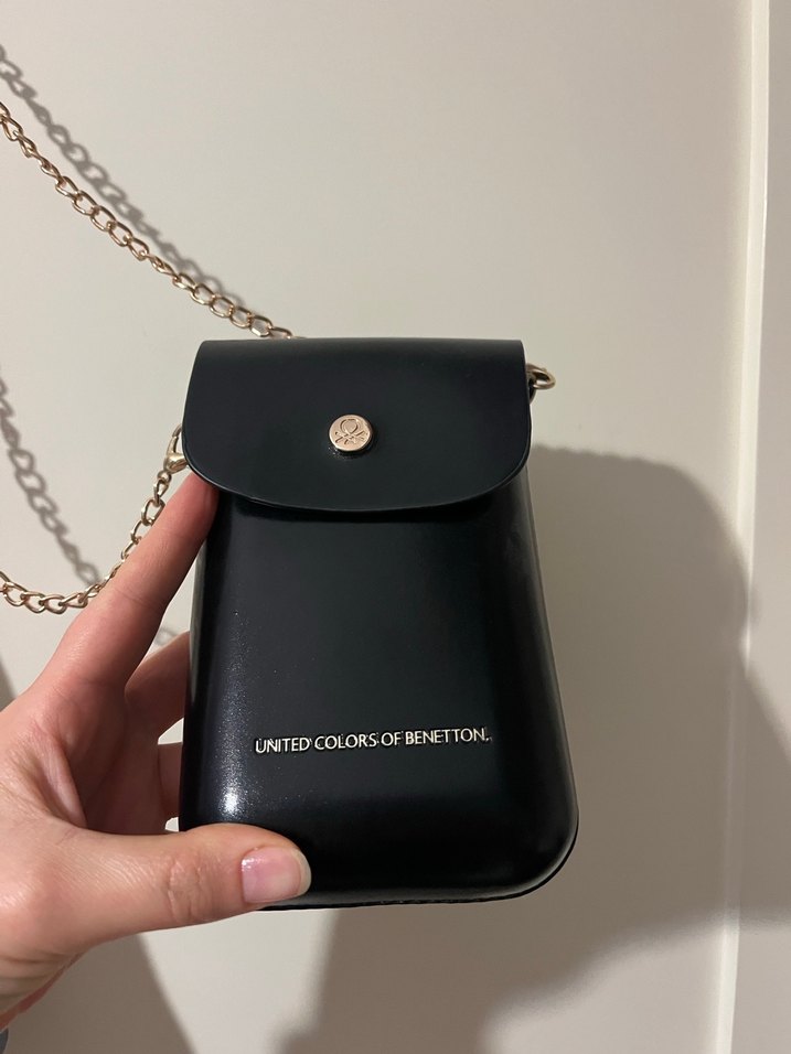 United Colors of Benetton marka, parlak siyah deri kadın çapraz çanta. Zincir askılı, düğmeli kapaklı, günlük kullanım için uygun, sokak tarzı çanta.