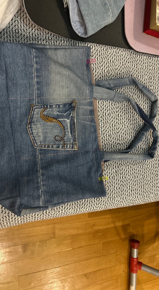 Nakışlı cep detayı ve fermuarlı kapanışı olan mavi kot kumaştan kadın çantası, trend sokak stili için uygun.
