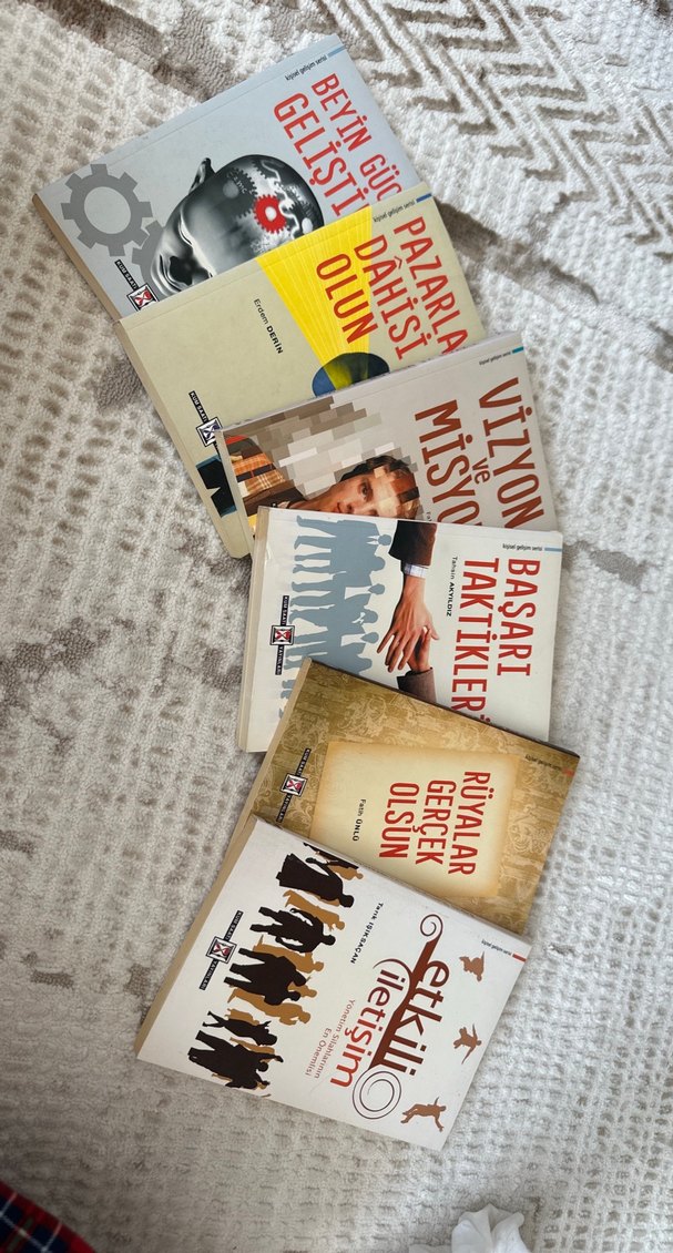 Pazarlama, vizyon, başarı taktikleri, rüyalar ve iletişim konularını içeren üniversite kitapları seti.
