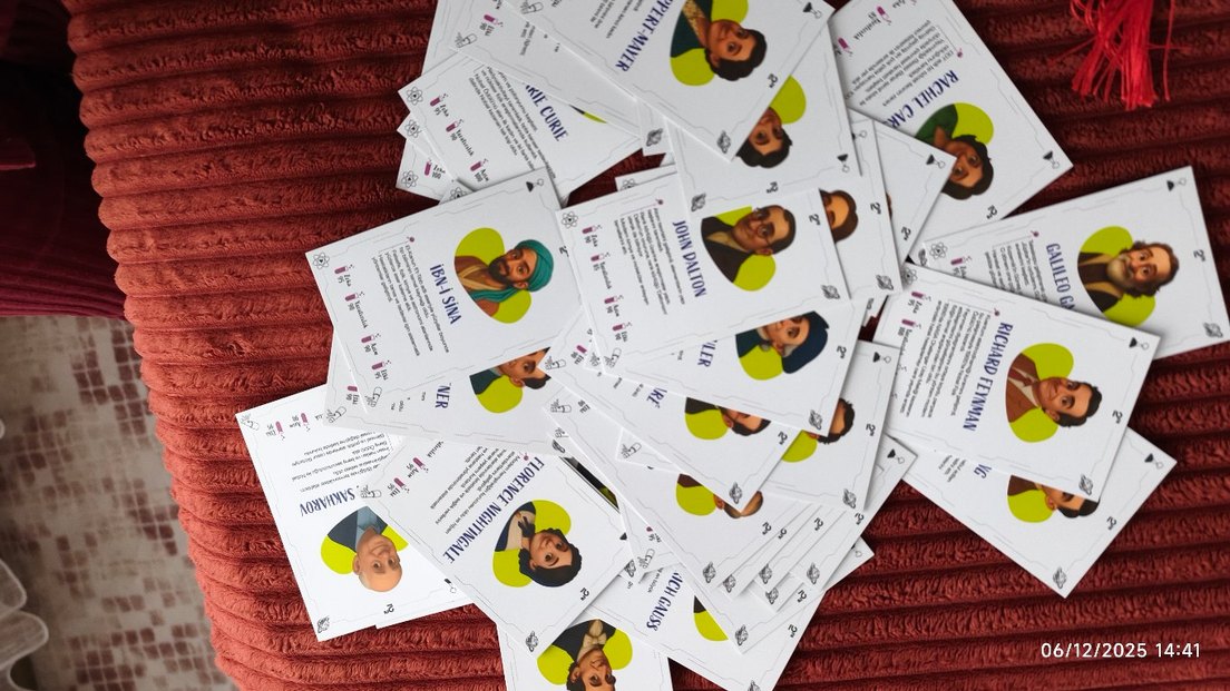 Ünlü bilim insanlarının yer aldığı, renkli ve bilgilendirici kartlar.