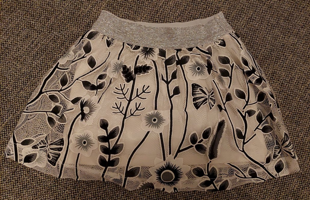 Unsea marka, 2 yaş için uygun, beli lastikli, ekru pamuklu iç astarı üstüne fileli lacivert çiçek desenli üst etek. Beli simli. Hem günlük hem şık kombinlenebilir.