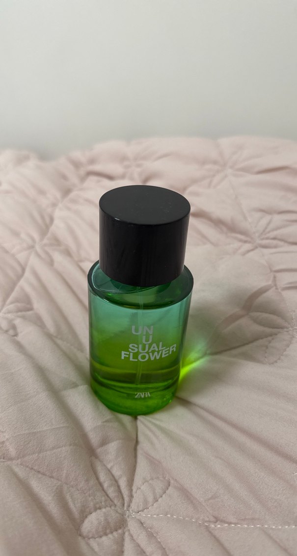 Unusual Flower kadın parfümü, siyah kapaklı yeşil cam şişede sunulur. Günlük zarafet için uygundur. 2 defa kullanıldı 100 mldir.