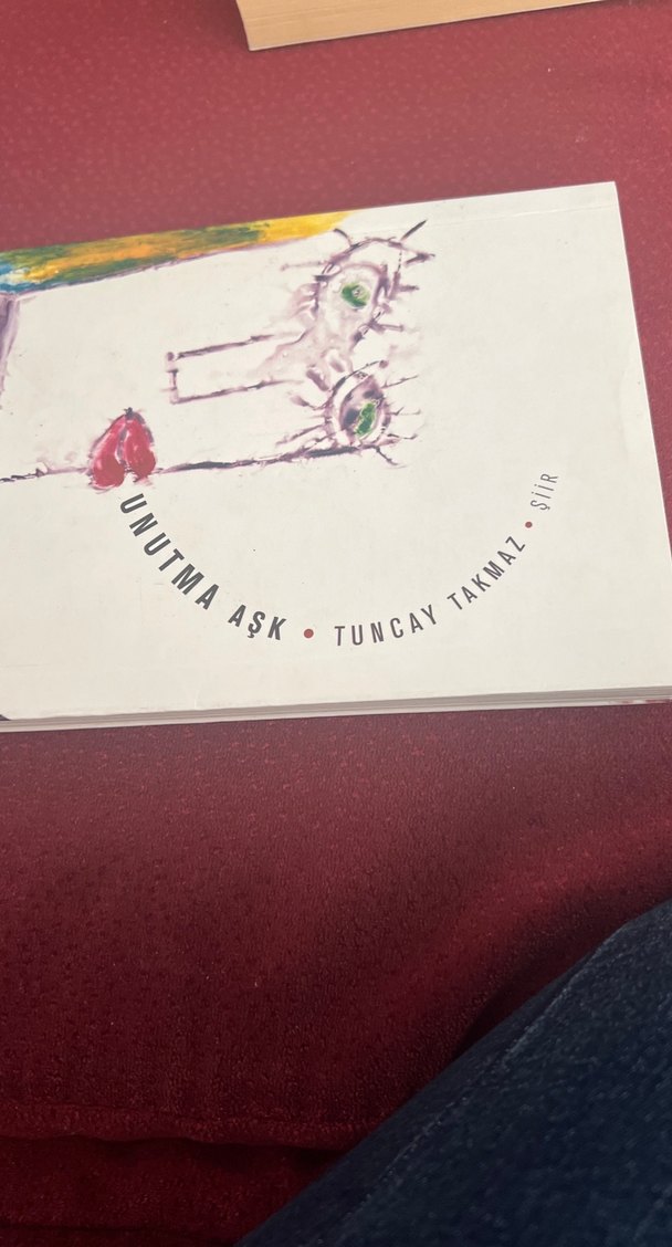 Tuncay Takmaz'ın 'Unutma Aşk' adlı şiir kitabı, göz ve kalp figürleriyle soyut bir kapak tasarımına sahiptir.