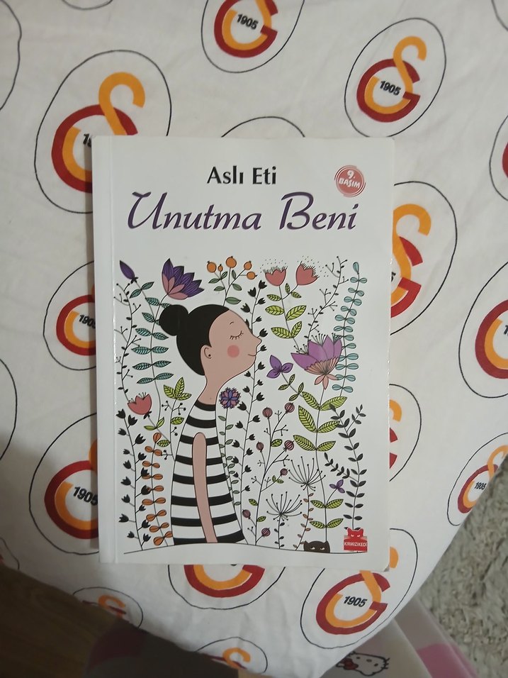 Aslı Eti'nin "Unutma Beni" adlı sanat kitabı, çizgili elbiseli bir kız ve zarif çiçek illüstrasyonları içeriyor.