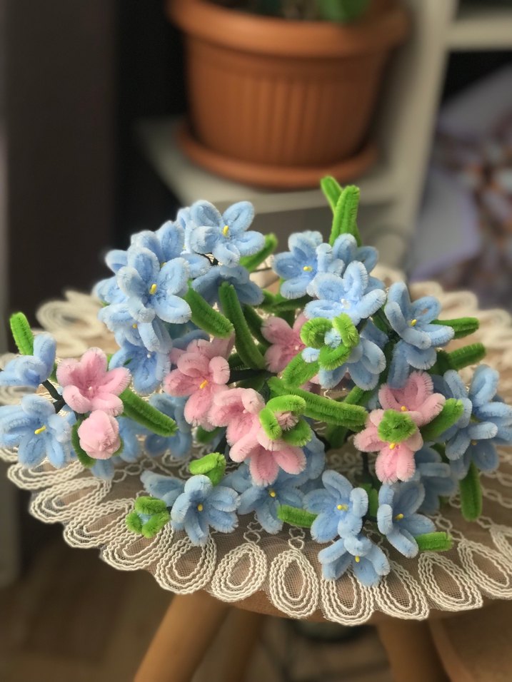 Küçük bir çiçek, büyük bir dilek; unutma beni çiçeği.. Birinci sınıf kadifemsi şönil teller kullanılarak hazırlandığı için dokunma hissi çok keyifli ve yumuşaktır. 37 cm uzunluğunda 7 dal şeklindedir. Vazo kullanımına uygun bol yapraklıdır. İstenildiği takdirde buketleme yapılarak gönderilir