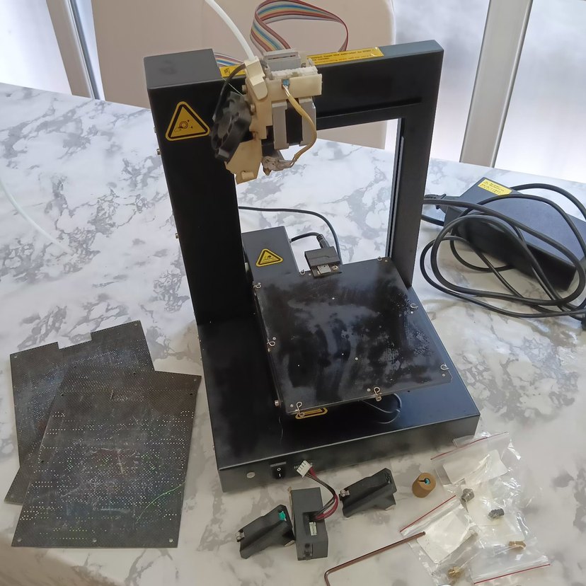 UP Plus 2 3D Printer 3 Boyutlu Yazıcı. 3 yıldır bende ortalama 2-3 ay kullandım. resimde görülen parçaları ile yollanıcak. Bir arızası yok. 0 nın fiyatı 800 dolar civarı ben 350 dolara satıyorum. Koyu renkli çerçeveye ve altın tonlarına sahip 3D yazıcı, kurulum için çeşitli parçalar ve kablolar içerir. ️