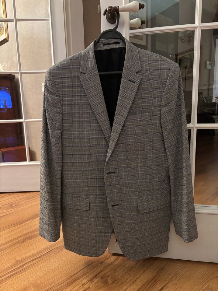 Uptown marka gri kareli desenli, düğmeli ve tek yırtmaçlı erkek ceketi. Uzun kollu, normal kesim ve klasik ofis tarzı veya spor giyim için uygundur. Yaklaşık ölçüler: omuzdan eteğe 76cm, iki omuz arası 45-46cm, kol boyu 62-63cm.
