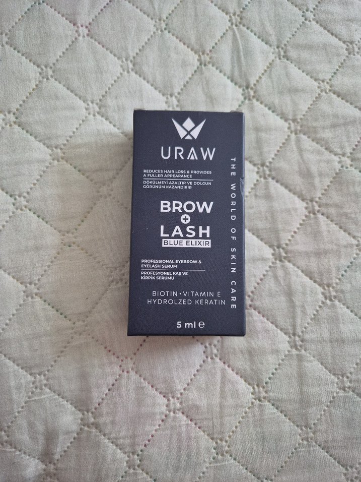 Uraw Brow & Lash Mavi Eliksir, biotin-vitamin ve hidrolize keratin içeren 5 ml serum, kaş ve kirpik dökülmesini azaltır ve görünümünü iyileştirir.