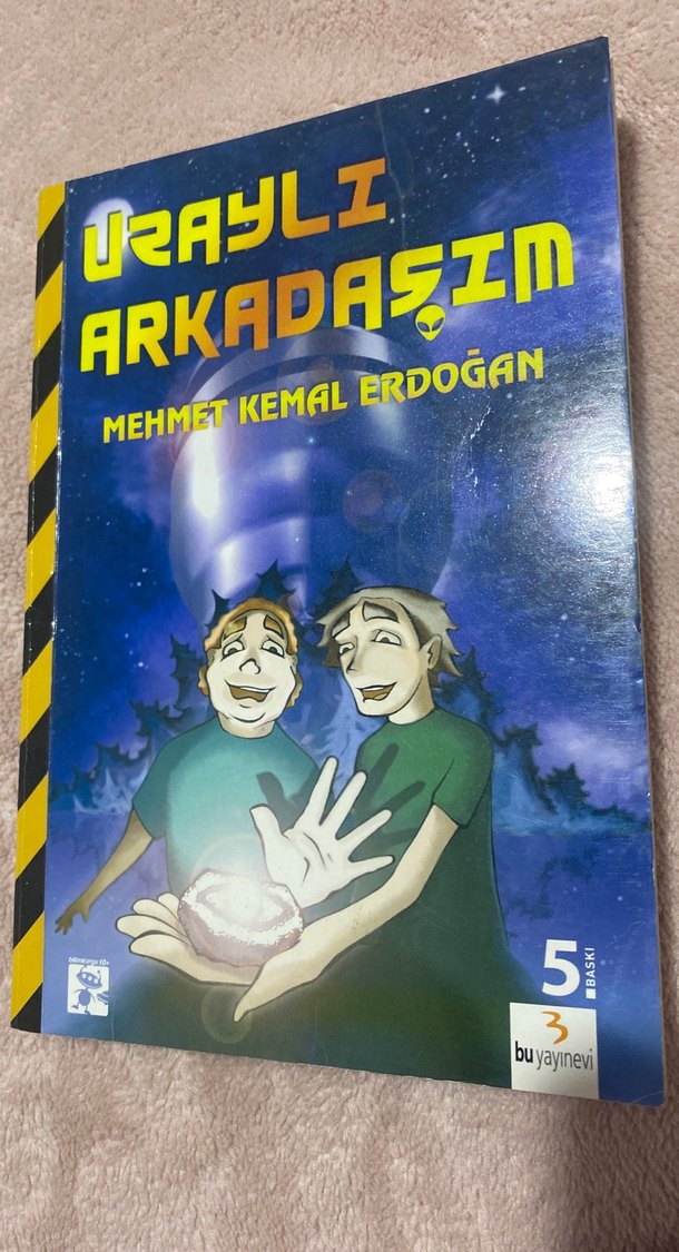 Mehmet Kemal Erdoğan'ın yazdığı Uraylı Arkadaşım çocuk kitabının uzay temalı kapağında iki karakter parlak bir nesne tutuyor.