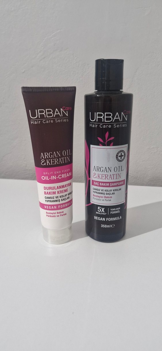 Urban Saç Bakım Serisi, argan yağı ve keratin içeren vegan formüllü krem ve şampuan ile yıpranmış saçları onarır, kırıkları giderir ve parlaklık verir. 350ml.