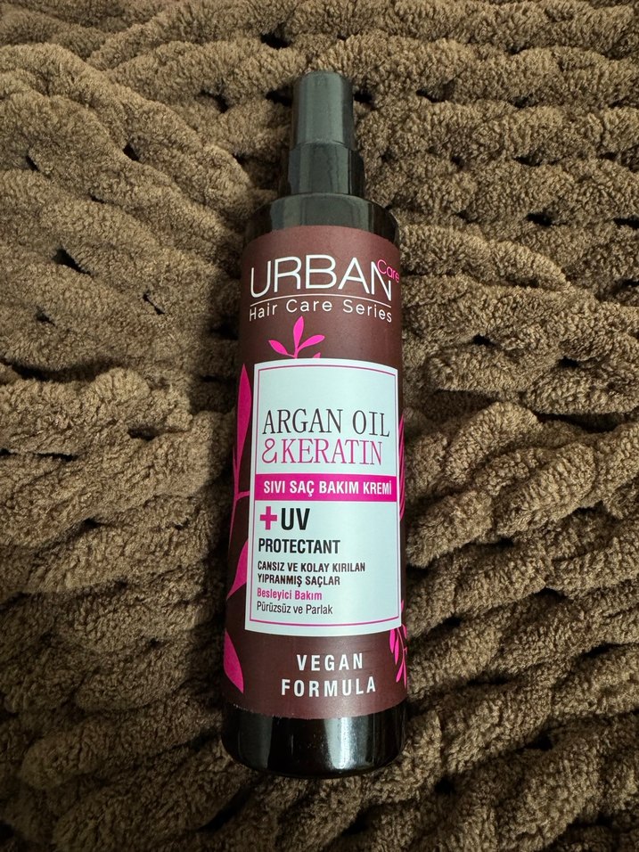 Urban argan yağı ve keratin içeren sıvı saç bakım spreyi, UV koruması sağlar. Vegan formül, saçı besler, kırılmayı ve kabarmayı azaltır.