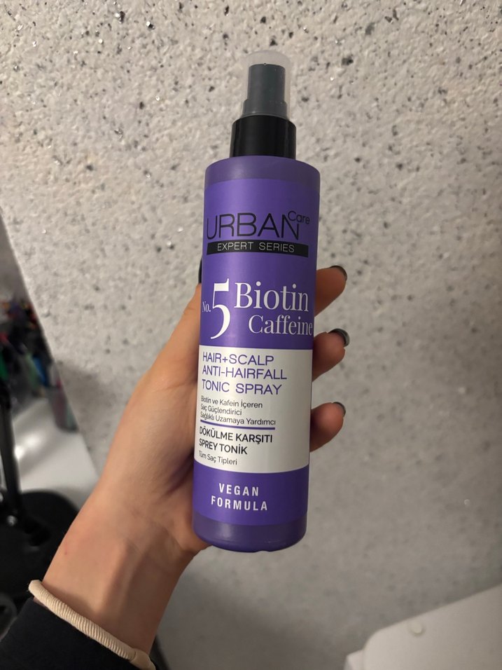 Urban Care 5 Biotin Kafein içeren saç ve saç derisi dökülme karşıtı sprey. Tüm saç tipleri için vegan formüle sahiptir.
