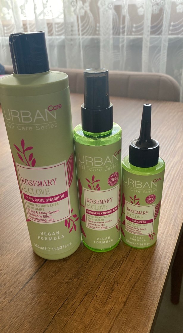 Urban Care Biberiye ve Karanfil içeren vegan formüllü saç bakım seti; şampuan, sprey ve serumdan oluşur, saç dökülmesini azaltır ve saç büyümesini destekler.