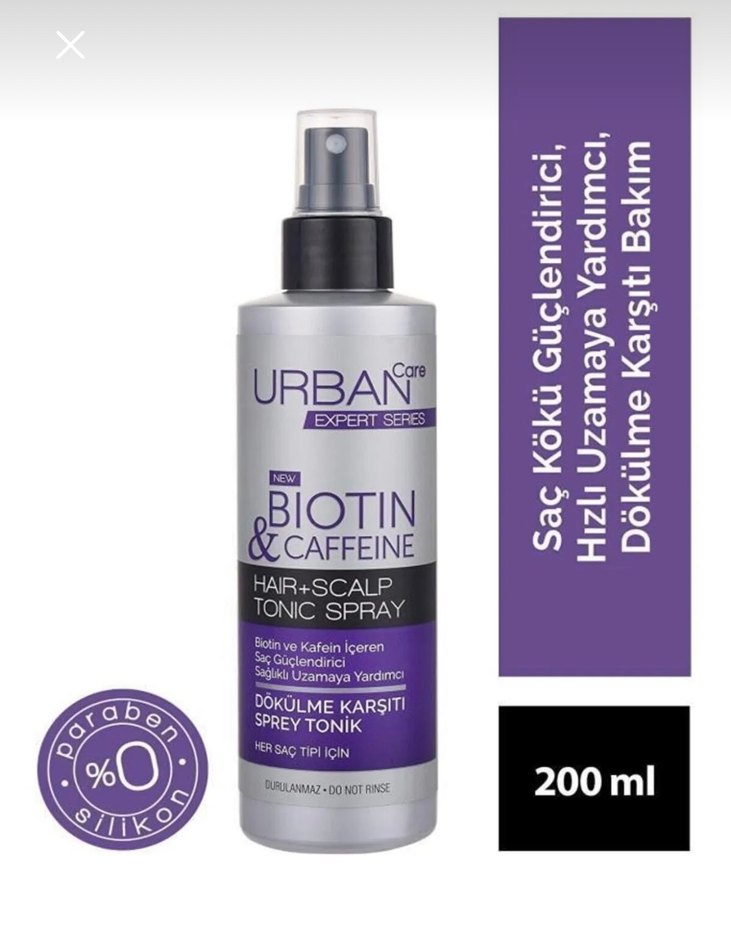 Urban Care Biotin ve Kafein içeren saç ve saç derisi sprey tonik, saç köklerini güçlendirir, hızlı uzamaya yardımcı olur ve dökülmeye karşı bakım sağlar. 200 ml.