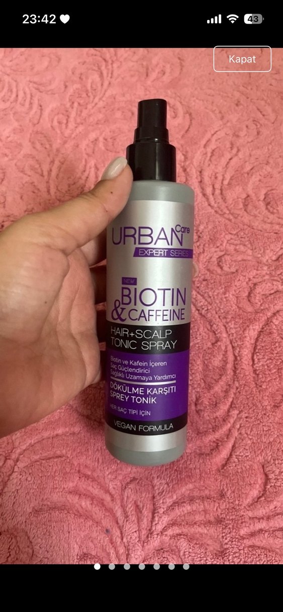 Urban Care Biotin & Kafein içeren saç ve saç derisi tonik spreyi, saçları güçlendirir ve sağlıklı uzamaya destek olur. Vegan formüllüdür.