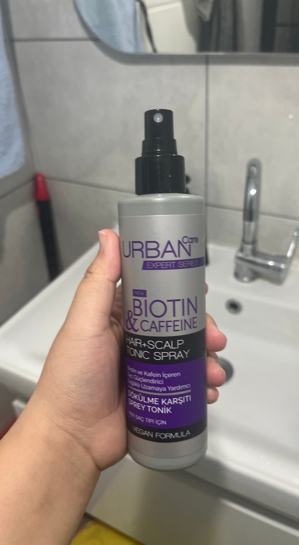 Urban Care Biotin & Kafein içeren saç ve saç derisi toniği, saçları güçlendirir ve dökülmeye karşı korur. Vegan formüllüdür. Yarıdan bıraz az