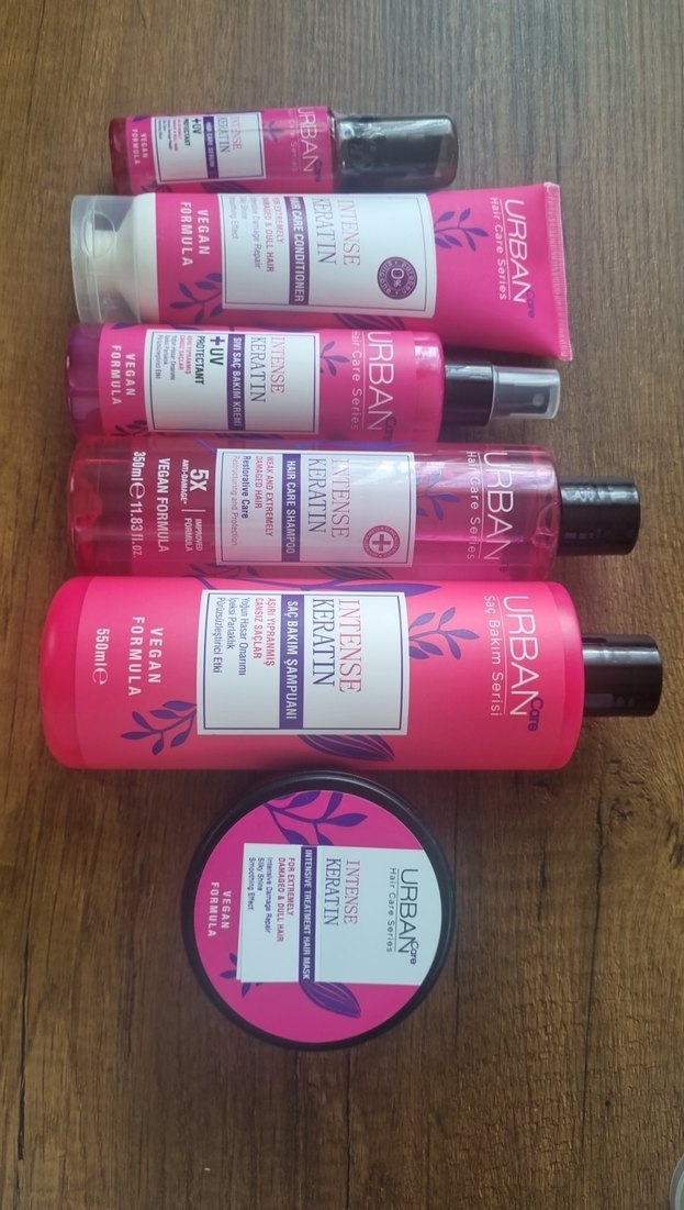 Urban Care Intense Keratin saç bakım seti; vegan formüllü şampuan, saç kremi, maske ve serum içerir, saçları güçlendirir ve onarır. ♀️