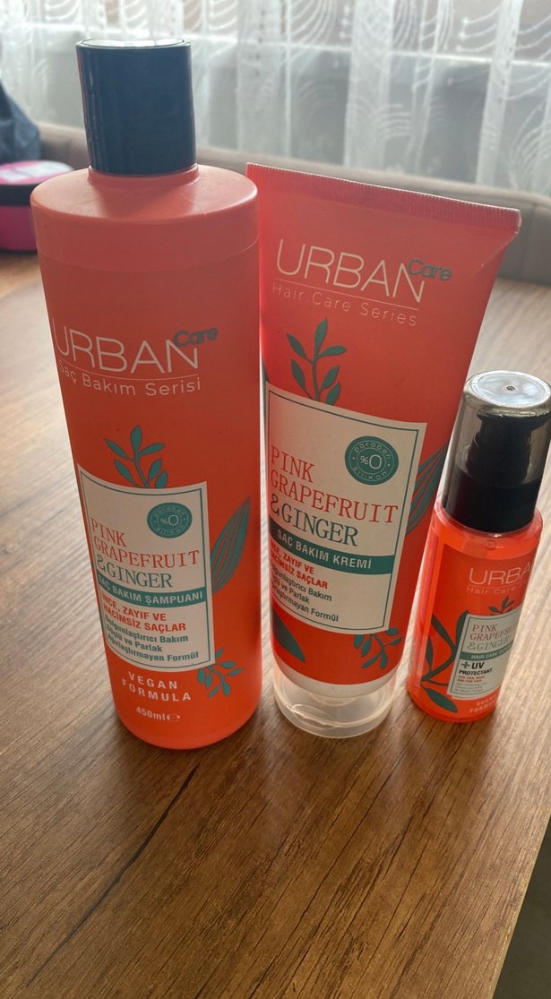 Urban Care saç bakım seti, pembe greyfurt ve zencefil içeren şampuan, saç bakım kremi ve serum ile saç güçlendirme sağlar.