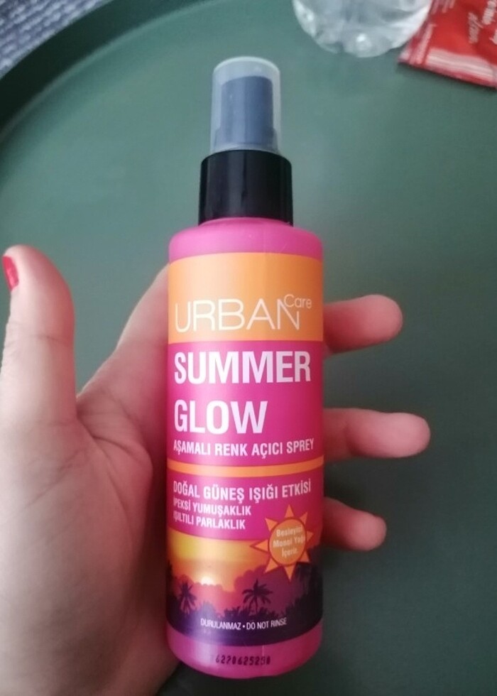 Urban care summer glow aşamalı renk açıcı sprey. Görsellerde detayları gösterdim. Çizgi olan yere kadar ürün doludur. Yarısından biraz fazla ürün doludur. Herhangi bir sorunu yoktur. Çok severek kullandım bir çok şişe de bitirdim ancak saçımı başka renk kullandığım için elden çıkarıyorum