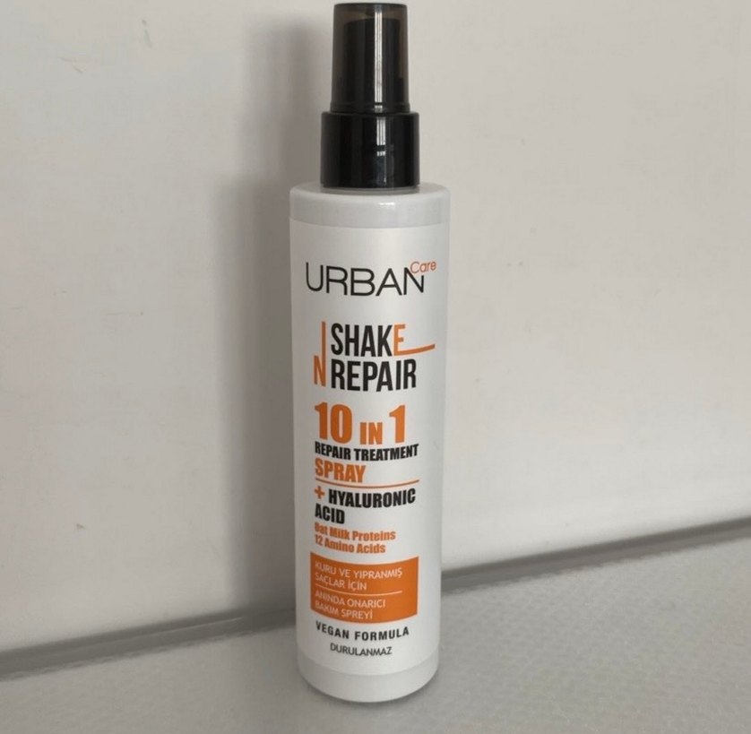 Urban Care Shake N Repair 10 in 1 sprey, hyaluronik asit, süt proteinleri ve amino asitlerle onarım sağlar. Kuru ve yıpranmış saçlar için uygundur, vegan formüllüdür ve durulanmaz. İki kez filan duştan sonra kullandım, hindistan cevizi kokusu seviyorsanız çok seversiniz.