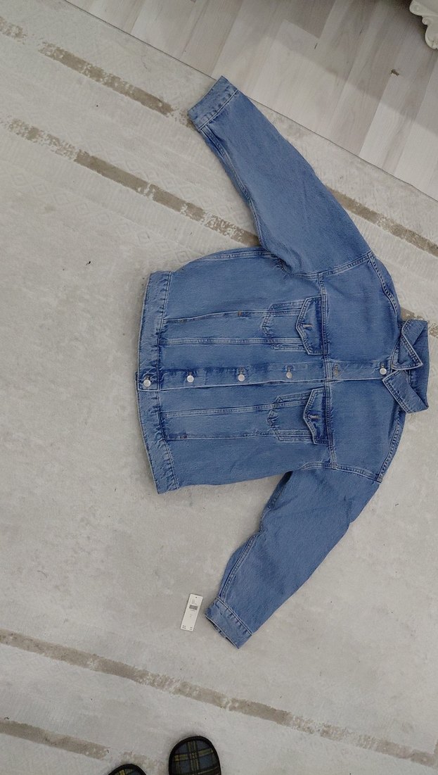 Düğmeli, mavi renkli, notched lapel yakalı, uzun kollu ve bol kesim kadın denim ceket. Günlük kullanıma uygundur.