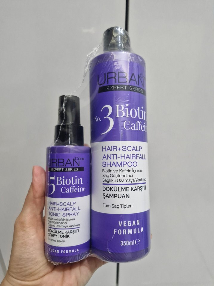 Urban Expert Serisi biotin ve kafein içeren şampuan ve sprey seti, saç ve saç derisini güçlendirerek dökülmeyi azaltır. Tüm saç tiplerine uygun vegan formül.